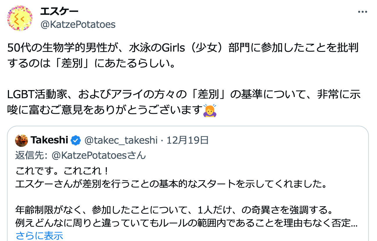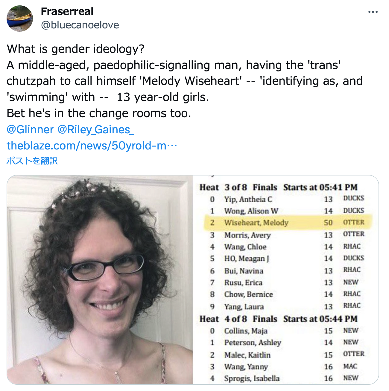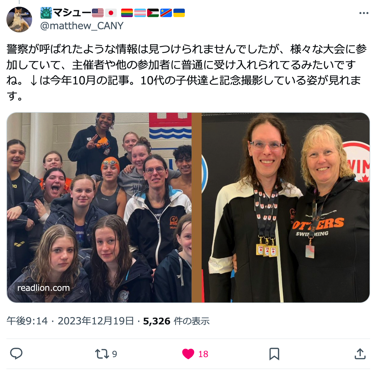 今年、カナダのスイミングクラブのクラブ内競泳会みたいなイベントで、10代女子の選手に混ざって50代のトランス女性が出場したことが、海外のアンチLGBTQ+勢に注目され、一斉に避難を浴びました。