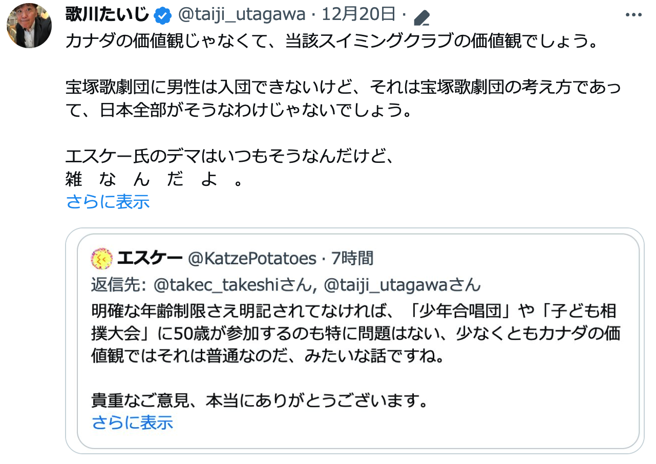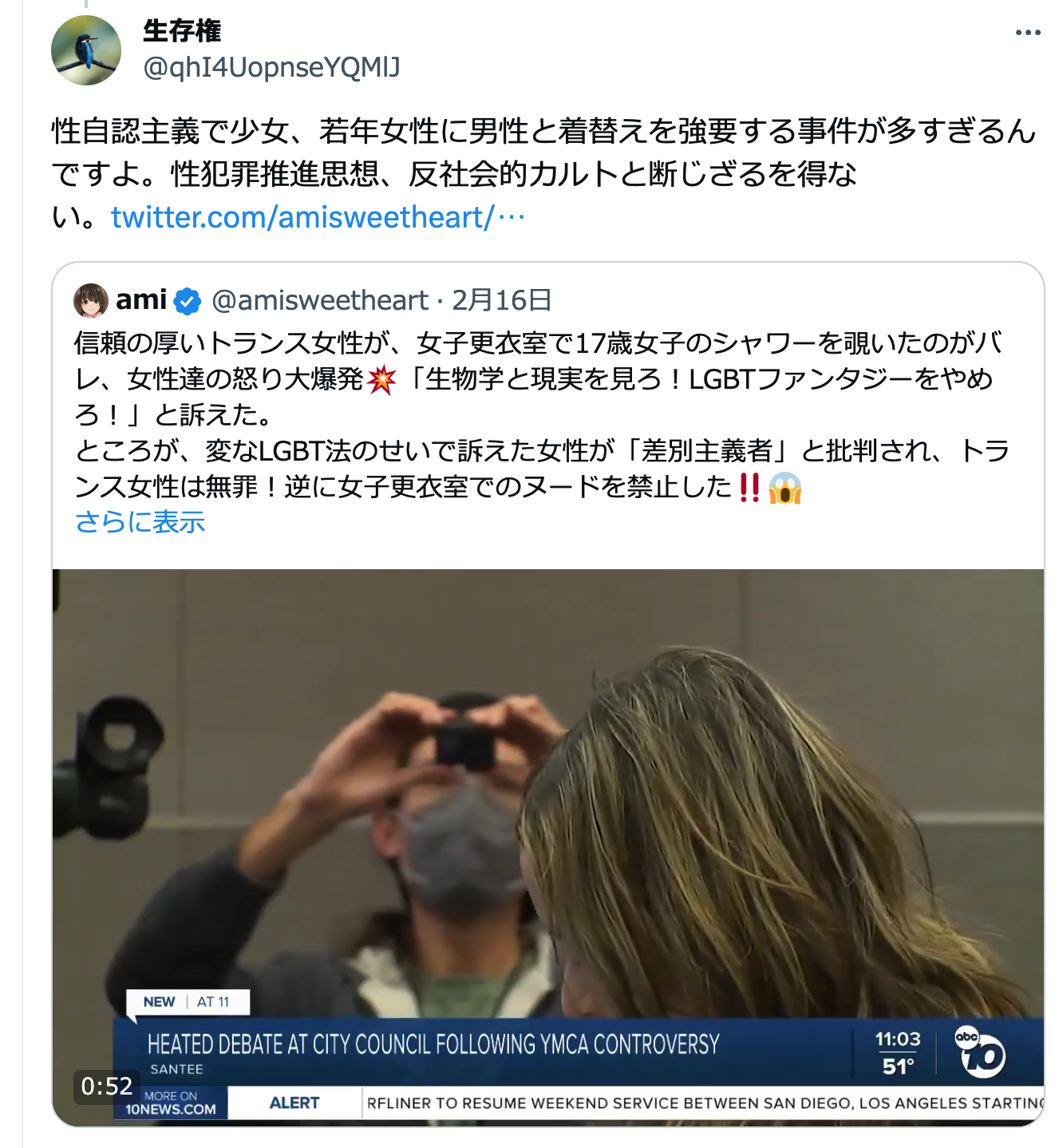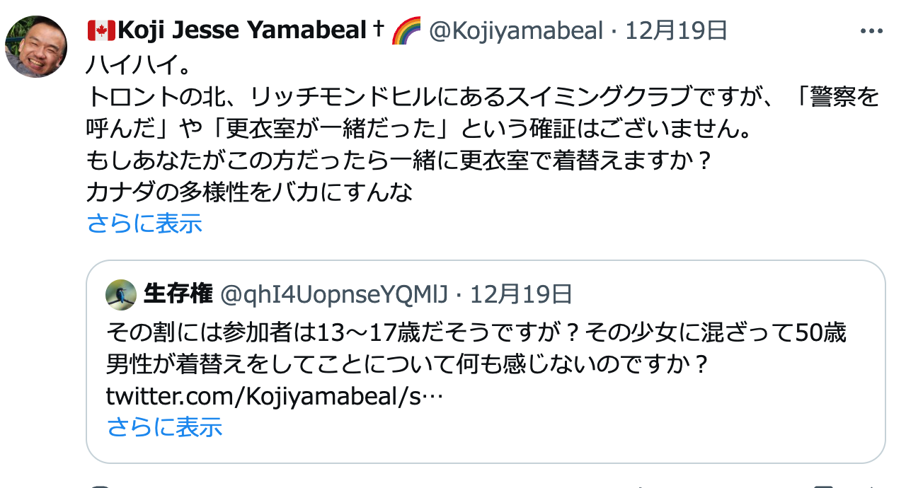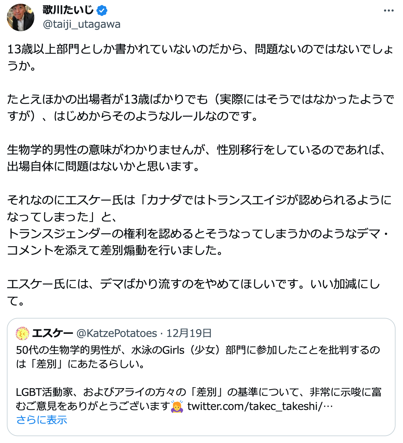 今年、カナダのスイミングクラブのクラブ内競泳会みたいなイベントで、10代女子の選手に混ざって50代のトランス女性が出場したことが、海外のアンチLGBTQ+勢に注目され、一斉に避難を浴びました。