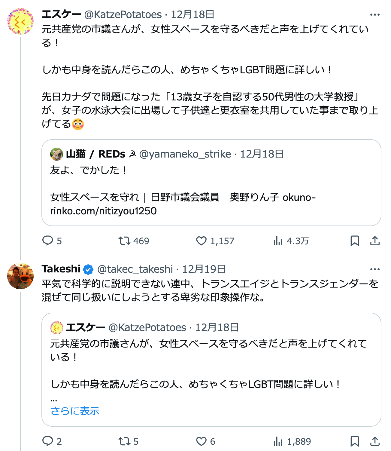 このエスケーというアカウント名の人物、めっちゃくちゃトランスジェンダーのヘイターでデマゴーガーなんです。まさに息をするように嘘をつく、エスケーというよりは「ほんまけー」という感じのヤバスな要注意アカウントとして有名なんです。そのエスケーが、ここぞとばかりにデマを流しはじめたので、差別デマ許さん勢(私を含め)とのバトルをご覧ください。
