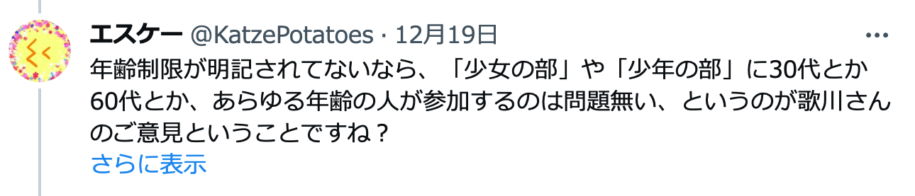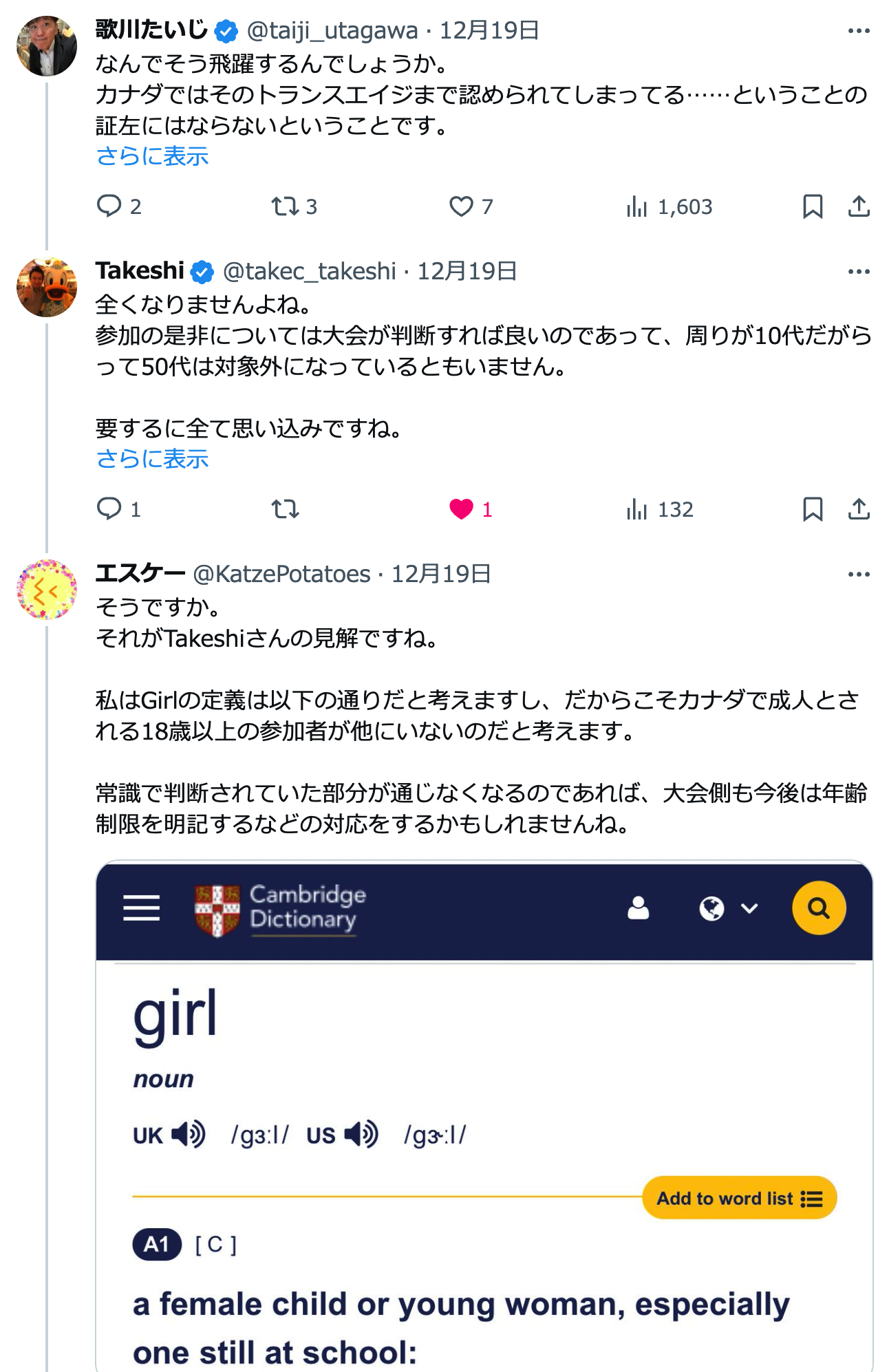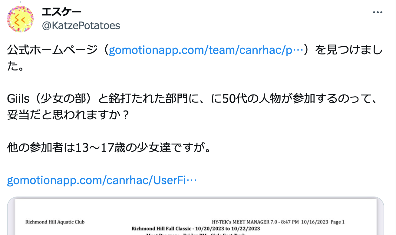 エスケー氏の示した資料を見てみると、確かに13歳ぐらいの少女に混ざって50代が出場していたようですが。