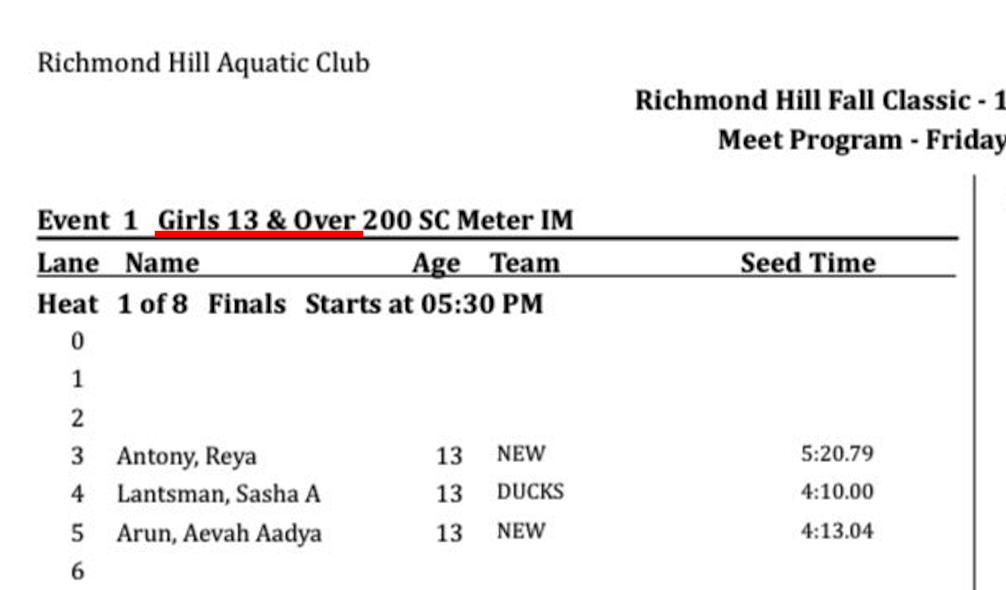 水泳大会の年齢規定は、13歳以上の女性ならば何歳でも参加できることを示していました(ヘイターのやることって、こういうの多いんですよね)。